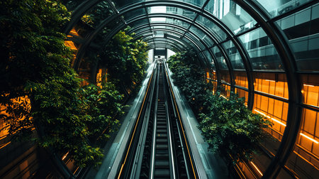 A long escalator ascends through a glass tunnel, flanked by lush greenery, creating a unique blend of nature and urban architecture with warm lighting and a sense of upward movement.