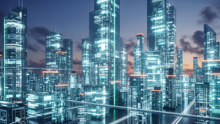 Modern skyscrapers in a digital city at dusk