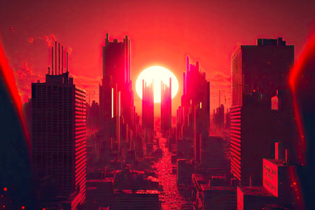 3d render neon e city with tall buildings and bright sun in red sky