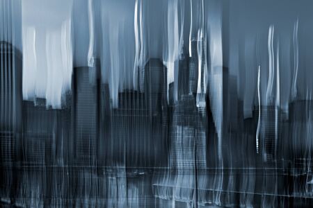 Panoramic view New York City Manhattan downtown skyline at night with skyscrapers in motion blur and blue tonality
