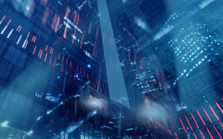 Double exposure of forex chart drawings over cityscape background. Concept of success.