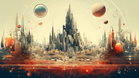vibrant digital collage combining vintage photography and futuristic cityscape with abstract shapes. Perfect for modern art, album covers, and advertising.