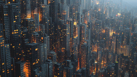Looking up at towering skyscrapers, their dark silhouettes contrasted by warm lights inside, the evening sky reveals a vibrant city scene that energizes the atmosphere.