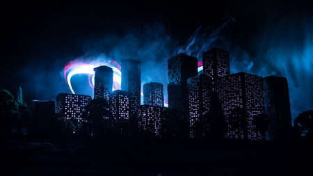 Empty street of burnt up city, flames on the ground and blasts with smoke in the distance. Apocalyptic view of city downtown as disaster film poster concept. Night scene. City destroyed by war.