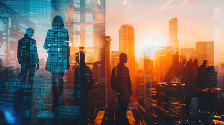 Silhouettes of business people working at corporate office in downtown. Work hard and business development concept. Double exposure --ar 16:9 Job ID: fa49b2df-319c-4c62-a77c-59421b083cfc