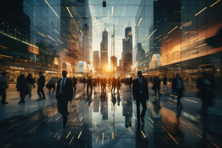 People move rapidly through a vibrant cityscape, their outlines softened by the warm hues of the evening sky reflecting off towering skyscrapers.