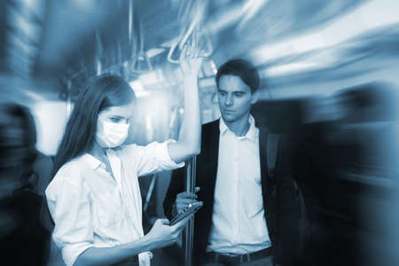 People with masks inside train , People on the train wear anti-virus masks and travel during rush hours. passengers inside the Sky Train , business people standing in metro mass transit subway.