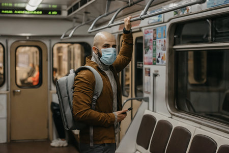 A man with a beard in a medical face mask to avoid the spread of coronavirus is looking around in a subway car. A bald guy in a surgical mask against COVID-19 is holding a cellphone on a metro train.