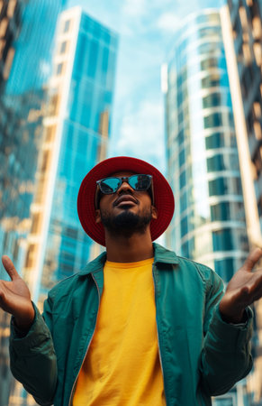 A man in a beanie and sunglasses gazes up at the skyline, reflecting the urban environment through mirrored glass buildings.