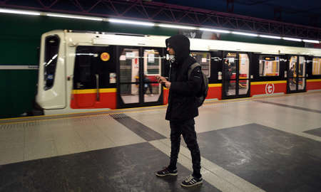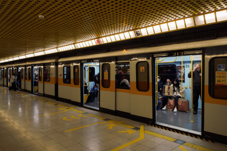 MILAN, ITALY - October 22, 2022: Unidentified passengers use mobile phones in subway.