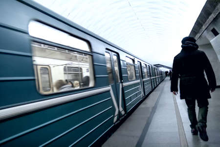 Russia Moscow June 2020. Moscow metro. effect of long exposure of the metro train movement. on the platform are people in protective masks. coronavirus epidemic in Russia. viral risk of infection. color