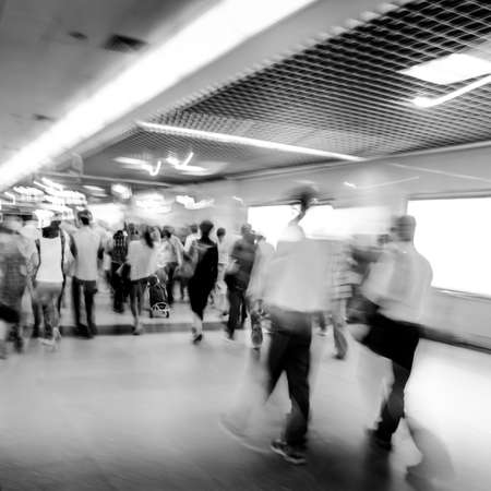 Blurred blurry soft focus background, interior of subway metro underground with passengers on a platform waiting