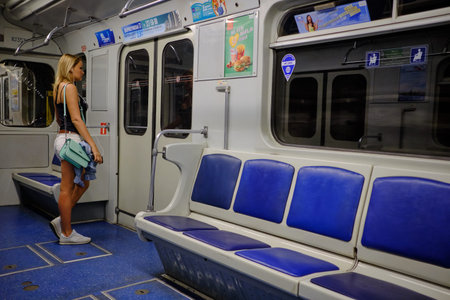St. Petersburg, Russia - June 14, 2018: One girl in an empty metro car. At a later time in the subway few passengers.