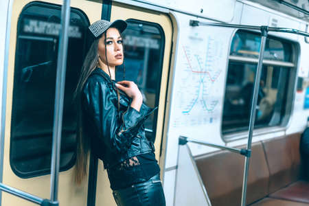 sexy woman in stylish clothes with long brown hair stands by back at the door in a train car. glamorous female in empty Underground Train. Close-up. High quality photo