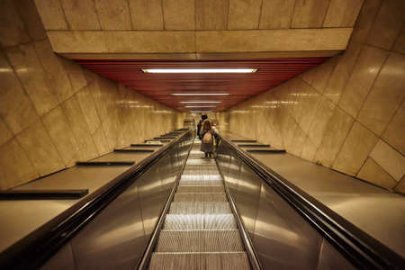Moscow. Russia. January 25, 2022. Wide angle view of the modern escalator of the Moscow Metro.