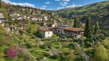 Elevated view captures a cluster of traditional, aged buildings with terra cotta roofs nestled into a steep, verdant slope. In the foreground, a cultivated garden space features winding paths and various blossoming shrubs in shades of green and pink, contrasting with the older stone structures below. The background reveals more houses climbing higher on the hill, with lush green mountains rising dramatically, featuring patches of residual snow near their summits under a bright, partly cloudy sky.