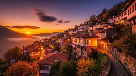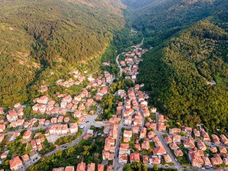 Aerial sunset view of village of Yavrovo with Authentic nineteenth century houses, Plovdiv Region, Bulgaria