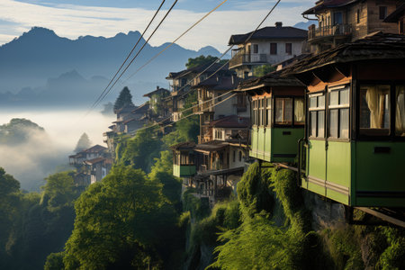 Cable car connects mountain neighborhoods in picturesque scene., generative AI
