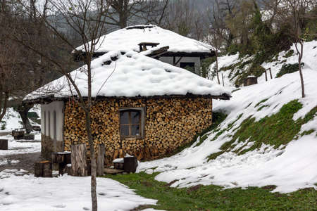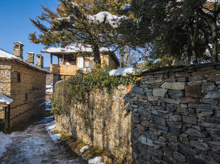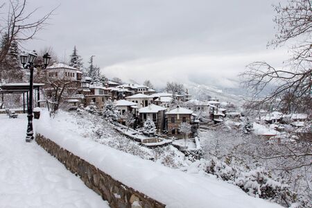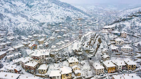 Winter Sunset view of Village of Kovachevitsa with Authentic nineteenth century houses, Blagoevgrad Region, Bulgaria