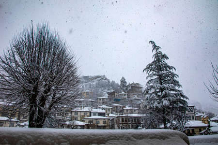 Aerial panoramic view of the snow-covered village of Piedmont, Italy.