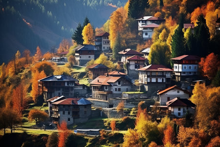 Autumnal village nestled in a mountain valley.
