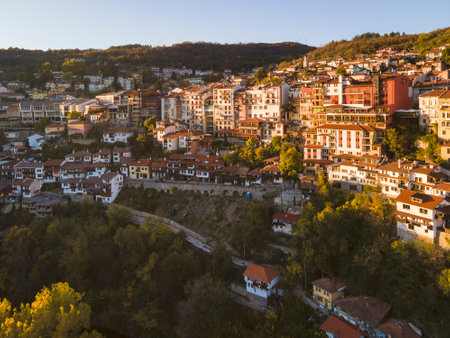 Amazing Aerial sunset view of city of Veliko Tarnovo, Bulgaria