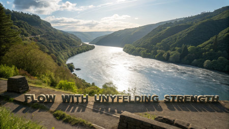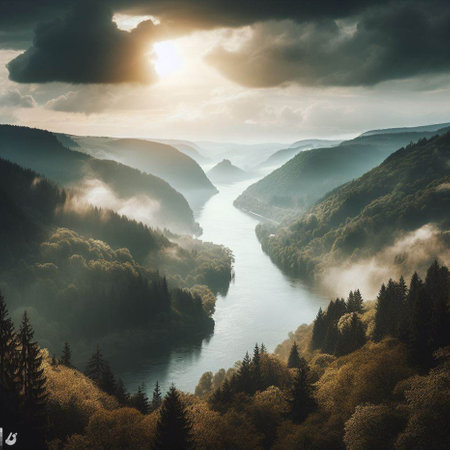 A breathtaking landscape featuring a wide river winding through a valley of verdant mountains, creating a stunning view, perfect for representing natural beauty and travel destinations.
