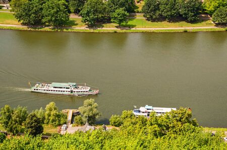 Moselle Valley Germany: View to river Mosel with Excursion boats near Bernkastel-Kues, Wine region Mosel in summer, Europe