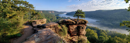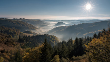 A breathtaking landscape captured in the early morning, showcasing a foggy valley blanketed by trees and rocky cliffs under a clear blue sky.