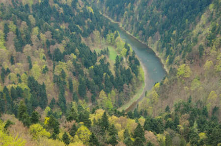 A view from the top of Sokolica to canoeists on the Dunajec River in spring