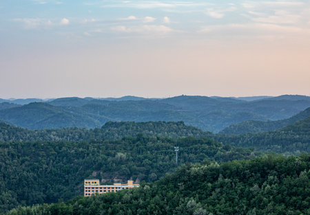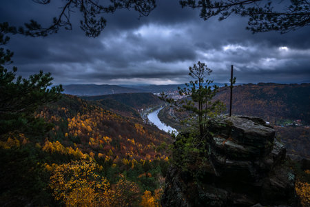 Great view to the amazingly deep valleys and dark forests with stormy clouds overhead in the electrifying evening.