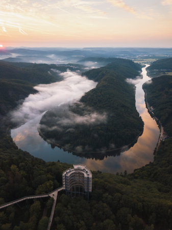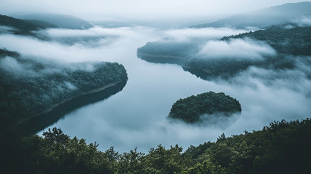 This captivating aerial view features a winding river surrounded by verdant mountains and enveloped in soft mist, creating a serene and peaceful atmosphere.