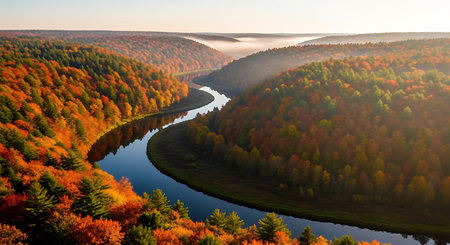 Scenic view of a winding river cutting through a dense forest with vibrant autumn foliage