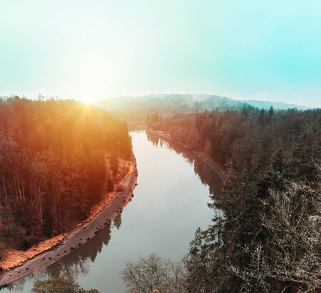Beautiful autumn landscape with river and forest at sunset. View from above.