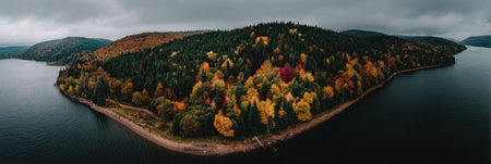 A panoramic view of autumn trees on a peninsula surrounded by dark water under a gray sky