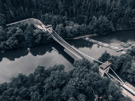Stádlecký Chain Bridge photographed from a drone, surrounded by lush nature and flowing river.