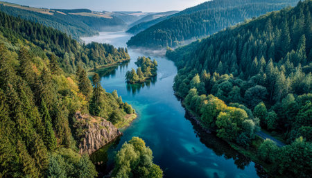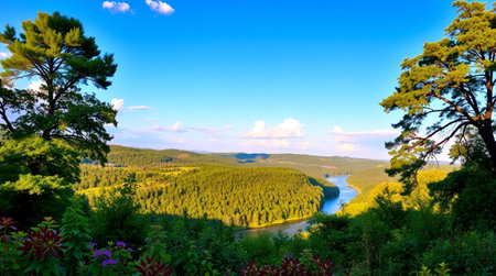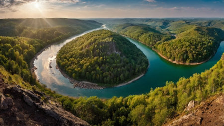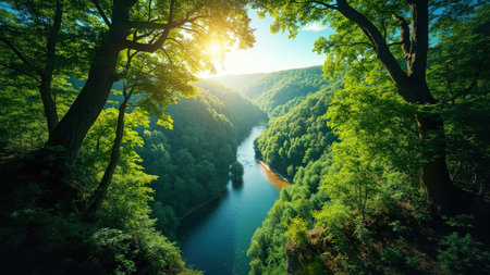 Experience the breathtaking beauty of a lush green river valley bathed in warm sunlight. This scenic image showcases a vibrant landscape where a flowing river carves its way through a dense forest of towering trees. An aerial view captures the expanse of the green valley, highlighting the natural beauty and serene atmosphere. Perfect for travel and travel destinations content, this panorama evokes a sense of tranquility and is ideal for illustrating concepts of nature, environment, and outdoors adventures.