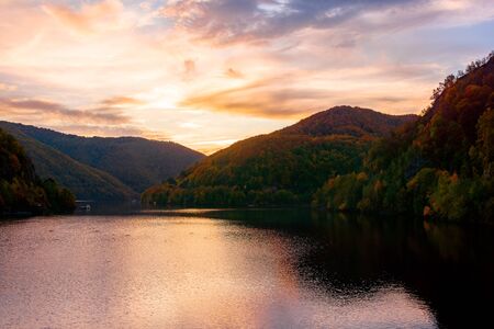 view from tarnita dam on the warm somes river. autumnal countryside landscape at sunset. trees in colorful foliage on the hill. apuseni mountains, cluj country, romania