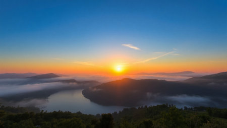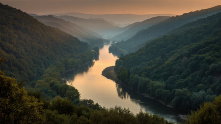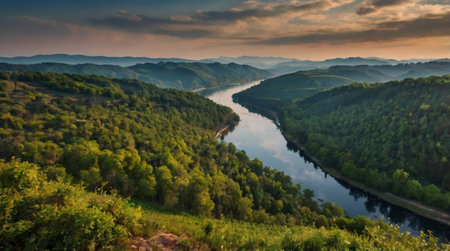 Experience a tranquil river landscape at dusk, where lush mountains embrace calm waters reflecting a warm sunset, creating a serene atmosphere in nature.