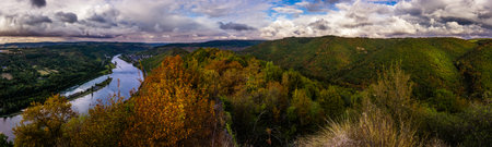 Neckar river valley view in autumn. Colorful orange foliage hills next to Heidelberg, Germany. Picturesque panoramic scenery. Pure nature, ecology, environmental conservation