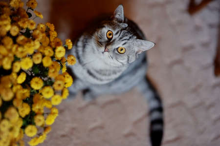 posing beautiful cat and a bunch of field of yellow flowers in a pot