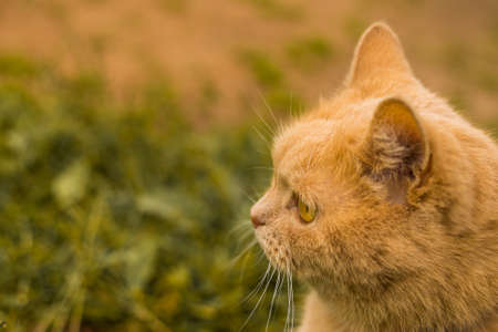 Cat in the green grass in summer. Beautiful red cat with yellow eyes.