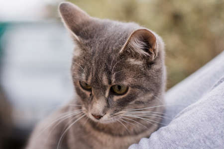 A young woman is holding a Scottish Straight kitten outdoors. The cat enjoys and purrs with his eyes closed and looks funny. Close-up, natural daylight
