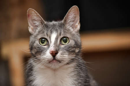 Close-up of a cat face. Portrait of a female kitten. Cat looks curious and alert. Detailed picture of a cats face with yellow clear eyes. Close up of cute feline face