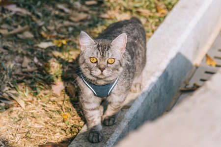 A little cat in harness walks outdoors. American Shorthair wearing vest looks at camera.