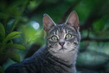 Portrait of a cat with green eyes looking up on a background of green leaves