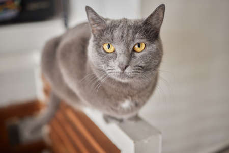 Portrait od gray striped shorthaired yellow-eyed domestic cat indoors near white wall