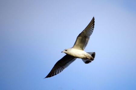 Flying Juvenile Kelp gull (Larus dominicanus), also known as the Dominican gull and Black Backed Kelp Gull. Blue ocean water background. False Bay, South Africa
