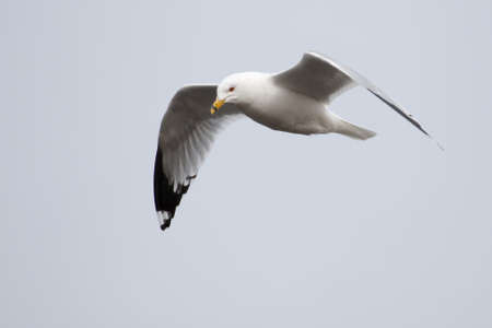 A portrait of an isolated single seagull flying through a bright white sky. The bird part of the laridae family has its wings wide open and is soaring through the air.