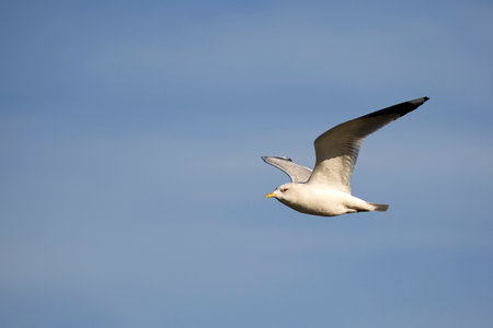 A single ring-billed gull soars gracefully through a vibrant blue sky, its wings spread wide, showcasing its distinctive black wingtips and yellow legs.